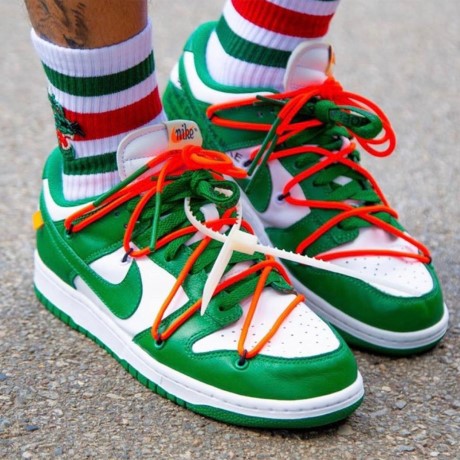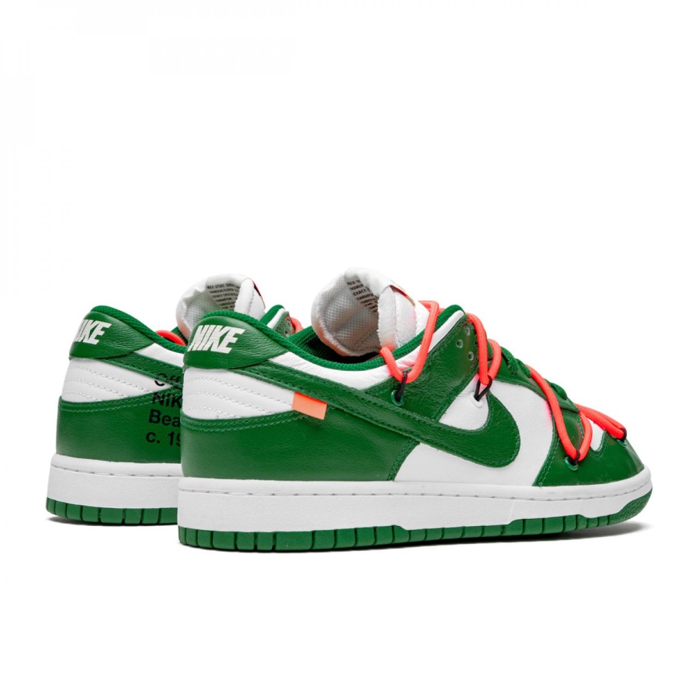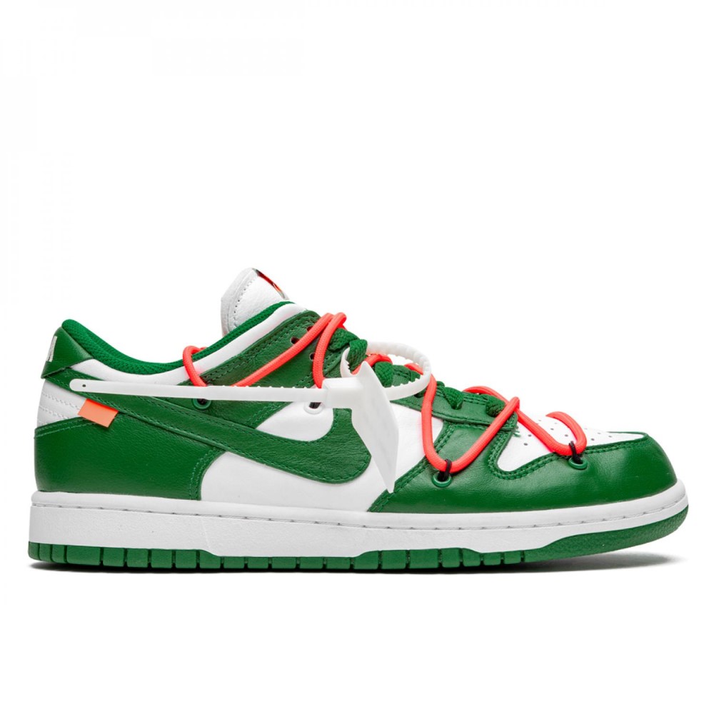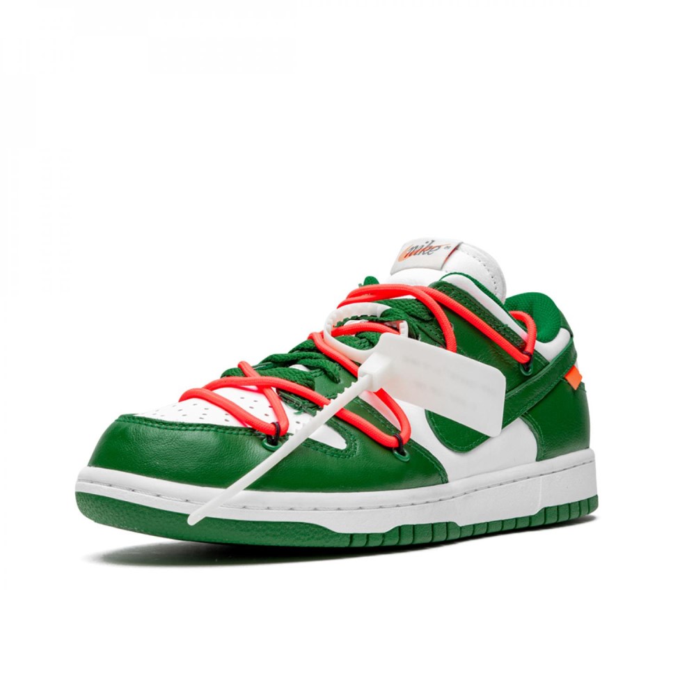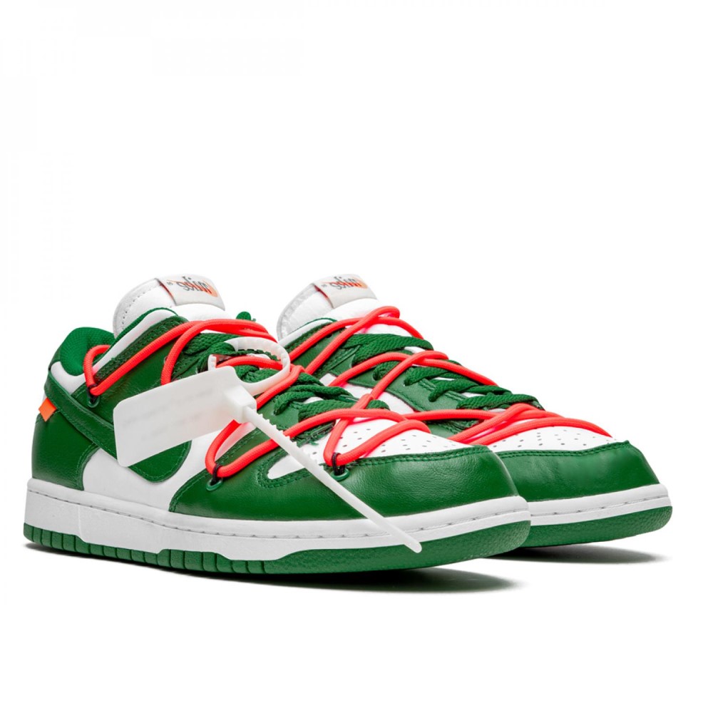 Долгожданная коллаборация Off-White и Nike Dunk радует фанатов чередой громких релизов. Дизайн сочетает в себе основу из белой кожи и акцентами тёмно-зелёного цвета. На кроссовках присутствуют стандартные красные шнурки, и необычная система шнуровки. Завершающим элементом модели стала классическая бело-зелёная подошва.