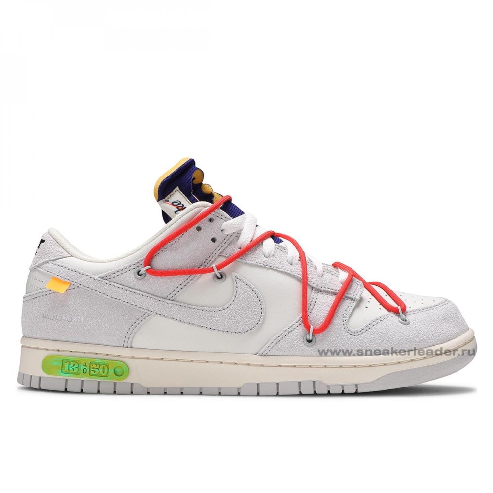 Кроссовки Off-White x Nike Dunk Low 13 of 50 взяты из коллекции «Dear Summer», первой коллаборации Вирджила Абло с Nike Dunk 2019 года. Низкий верх выполнен из белой кожи и вставками светло-серой замши. Визитной карточкой является печатный текст на внутренней стороне кроссовка. Контрастные всплески дизайна достигаются за счет красной вторичной системы шнуровки и открытого язычка из пеноматериала темно-синего цвета с пустым отверстием.
