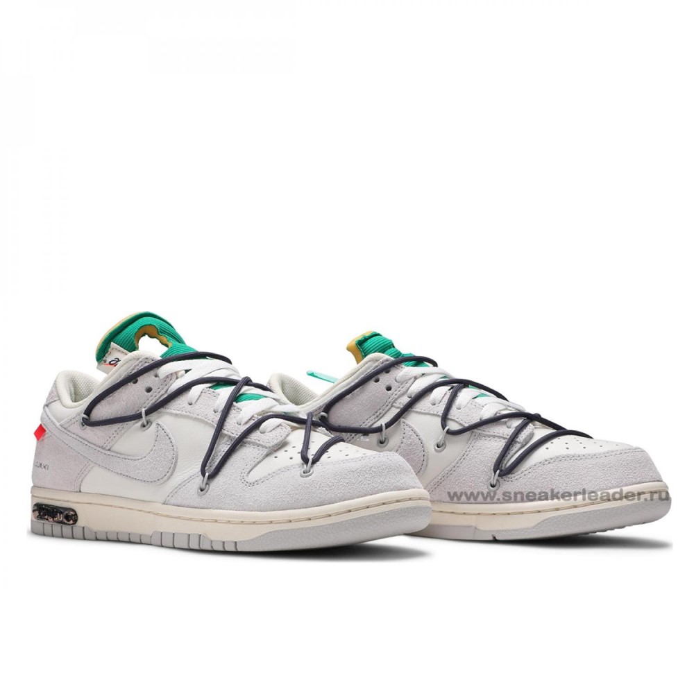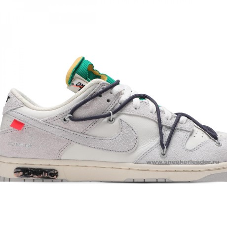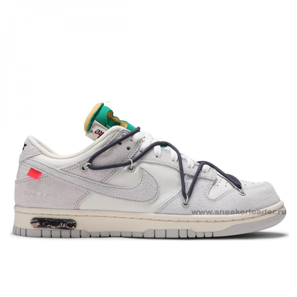 Кроссовки Off-White x Nike Dunk Low 20 of 50 взяты из коллекции «Dear Summer», первой коллаборации Вирджила Абло с Nike Dunk 2019 года. Низкий верх выполнен из белой кожи и вставками светло-серой замши. Визитной карточкой является печатный текст на внутренней стороне кроссовка. Контрастные всплески дизайна достигаются за счет синей вторичной системы шнуровки и открытого язычка из пеноматериала зелёного цвета с пустым отверстием.