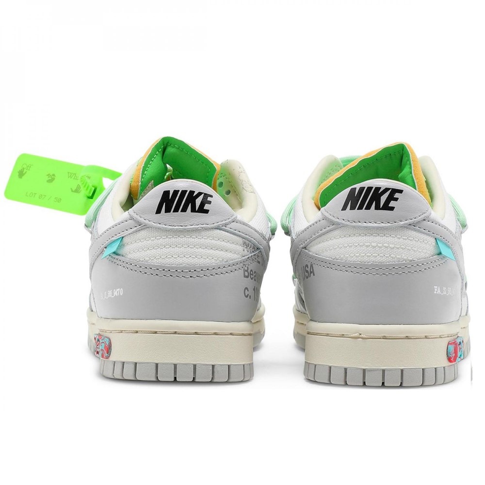 Кроссовки Off-White x Nike Dunk Low 07 of 50 взяты из коллекции «Dear Summer», первой коллаборации Вирджила Абло с Nike Dunk 2019 года. Низкий верх выполнен из плотной ткани белого цвета и вставками светло-серой кожи. Визитной карточкой является печатный текст на внутренней стороне кроссовка. Контрастные всплески дизайна достигаются за счет вторичной системы шнуровки и открытого язычка из пеноматериала зелёного цвета с пустым отверстием.